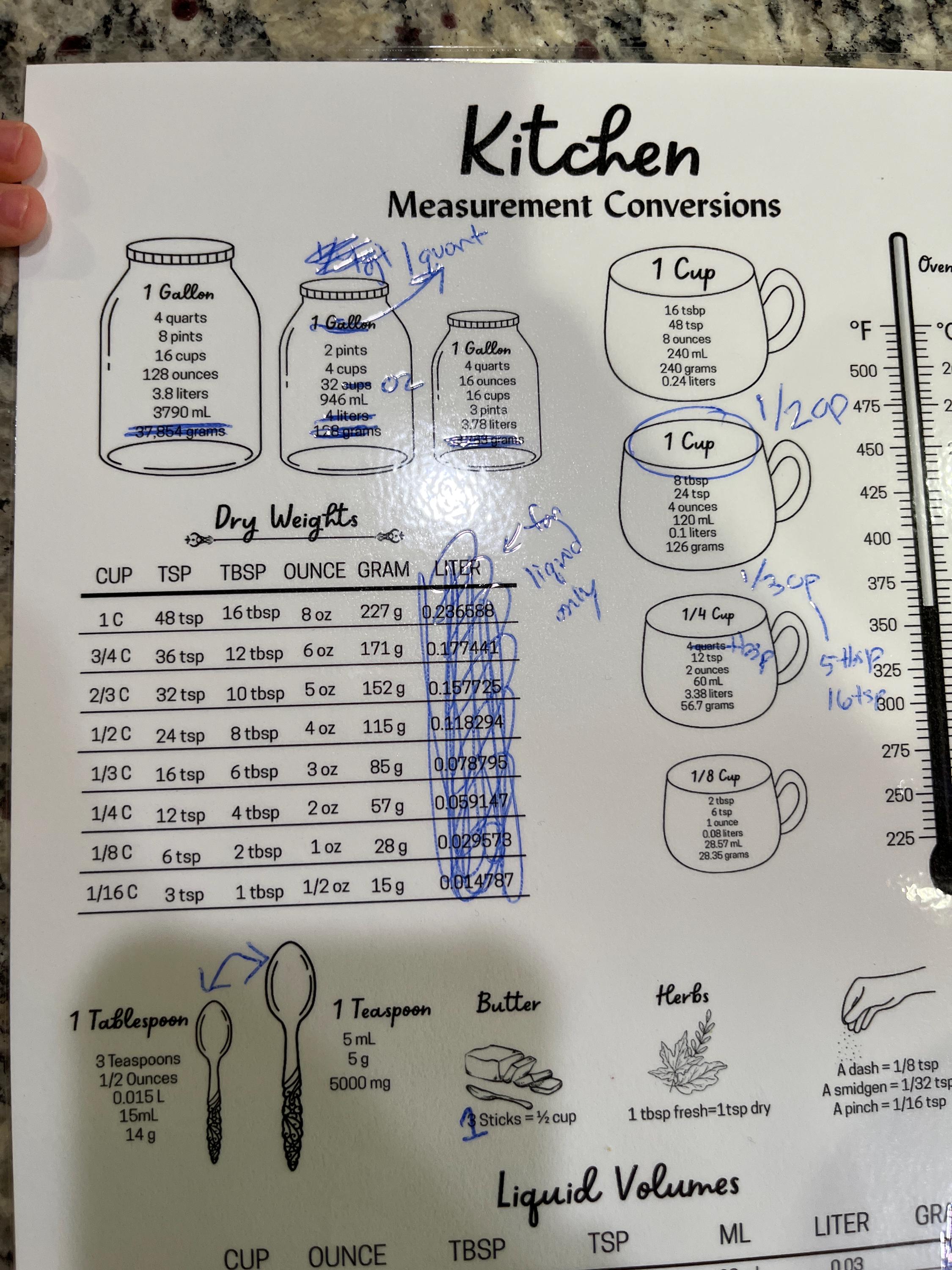 Full of typos, irrelevant conversions ( gallons [liquid] to grams[solid]) , and incorrect conversions . It was less than a dollar for a digital file but there was no proofing involved. The design is cute but the information is not helpful