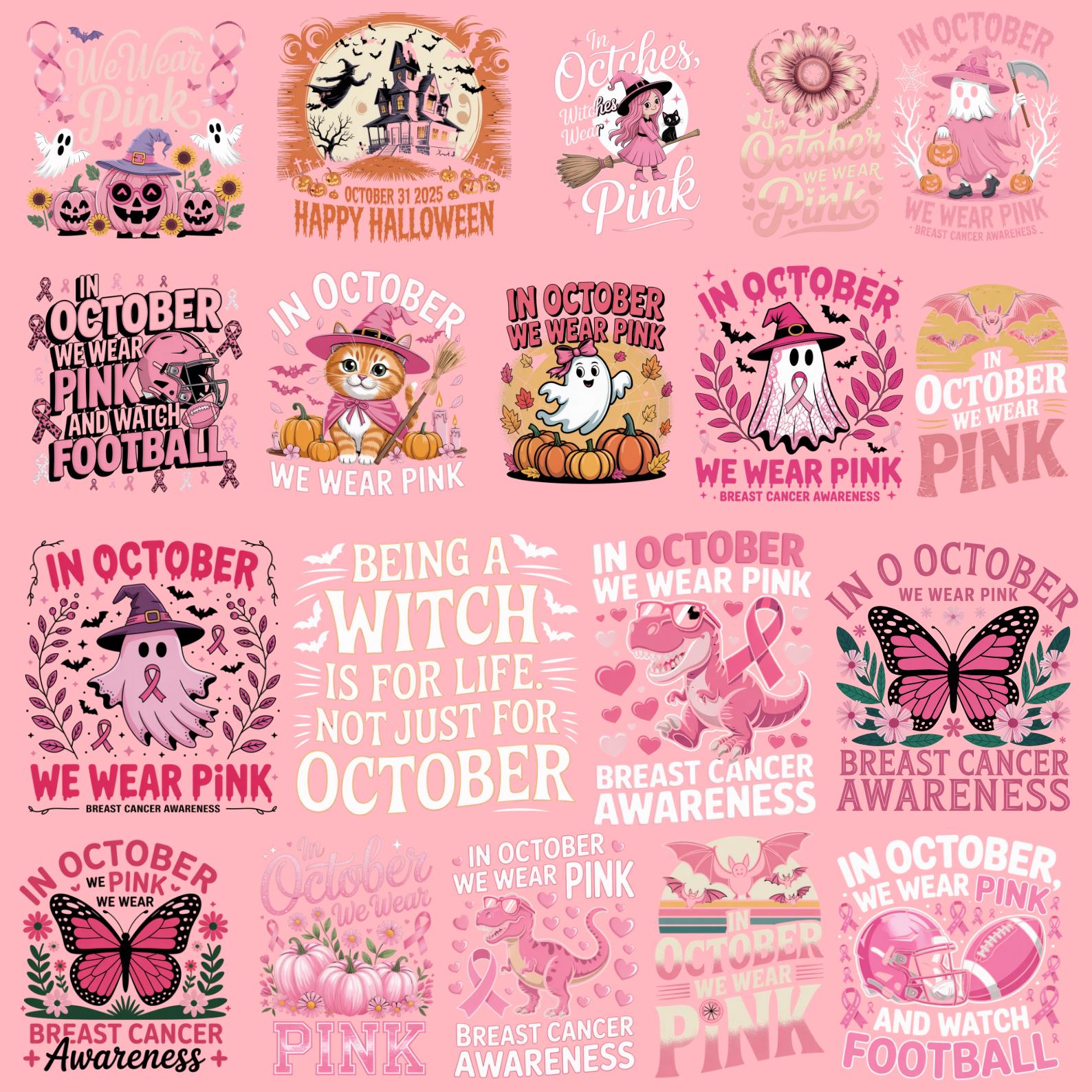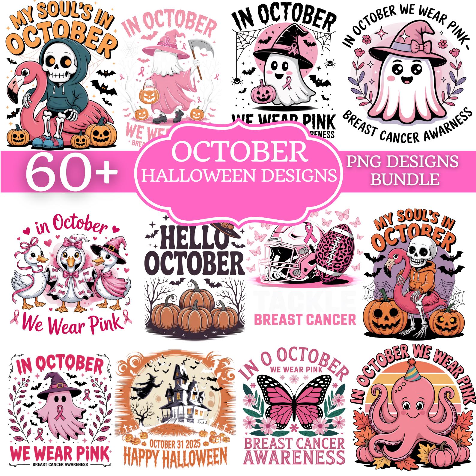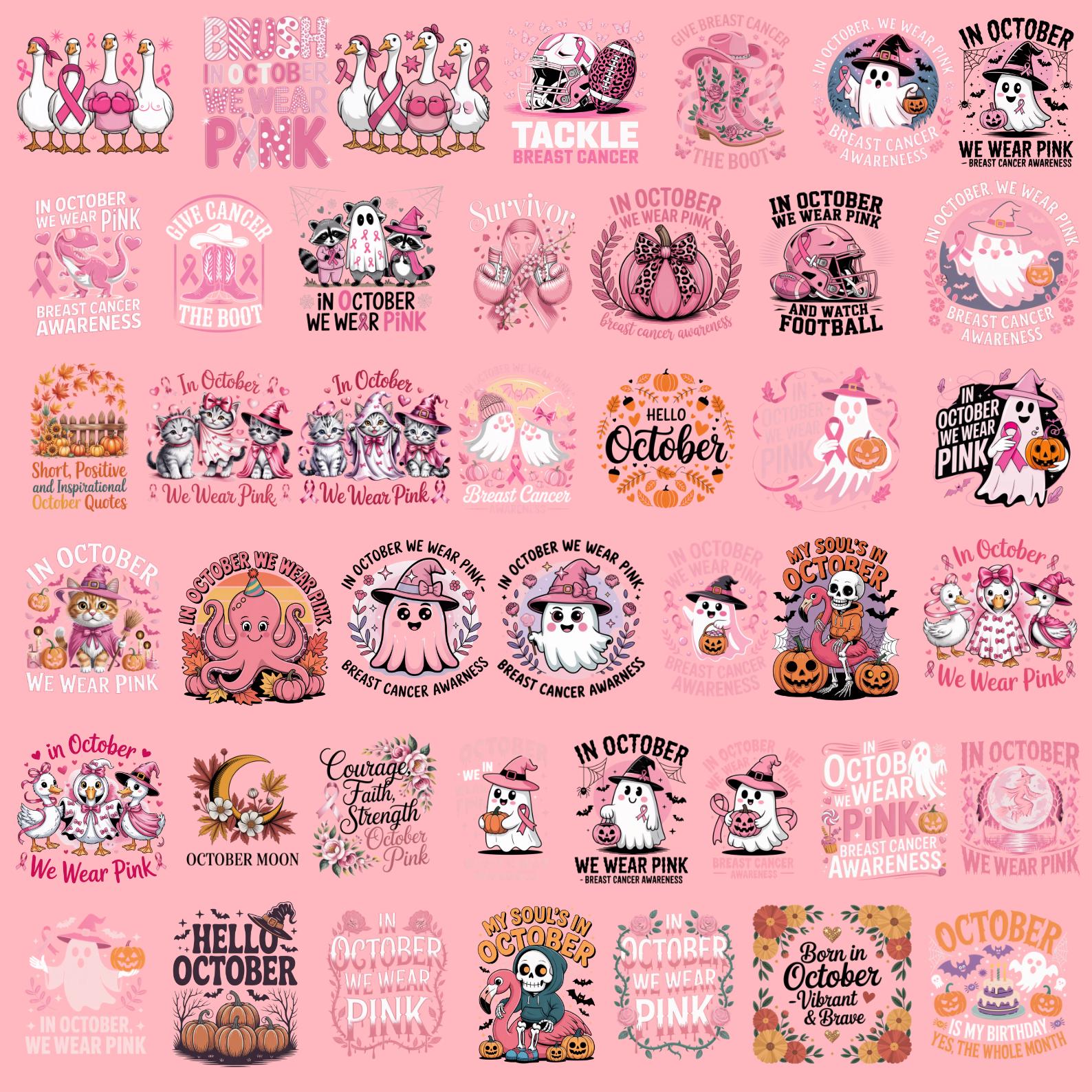 Bring awareness and creativity together with this 63 Designs Breast Cancer Awareness Halloween Bundle. Perfect for October, this collection features “In October We Wear Pink” quotes, rainbow accents, pink ghost woman designs, breast cancer awareness ribbons, and Halloween-inspired graphics – all created to support and spread strength, hope, and positivity.