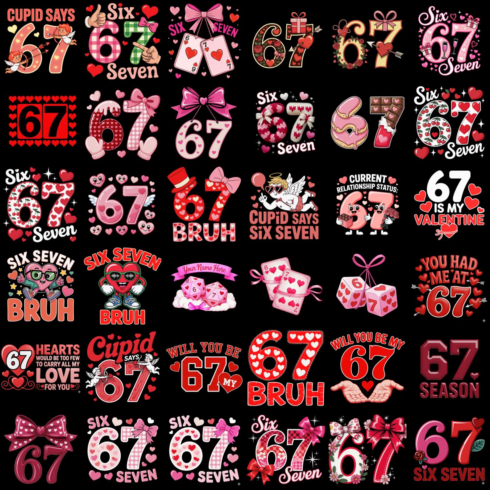 Coquette Valentine 67 PNG Bundle, Preppy Heart Bow Valentine Designs, Funny 6 7 Valentine Meme PNG, Bear Dice Six Seven Clipart, Valentine Sublimation PNG Download
