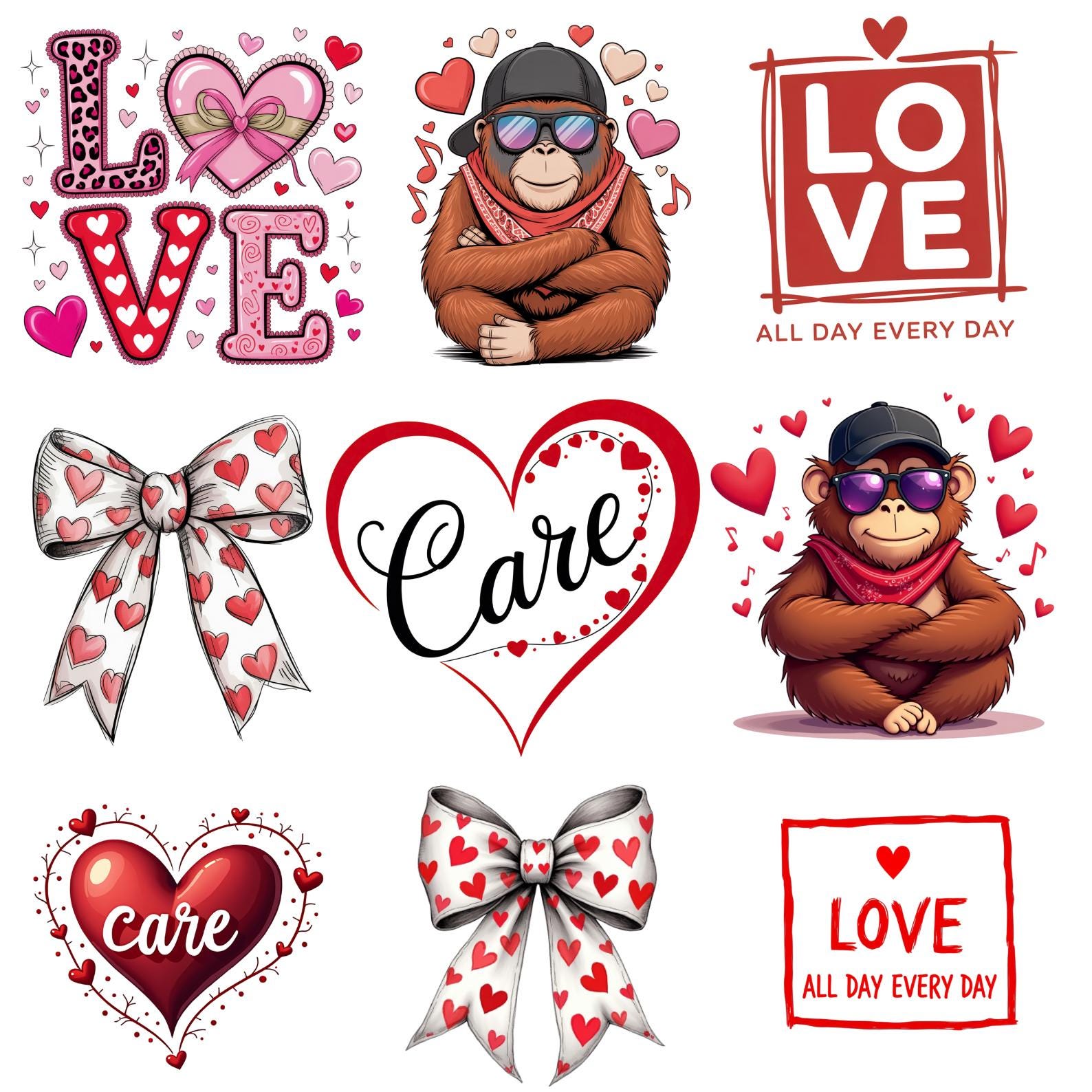 9 Valentine PNG Bundle, Cute Love Heart Bow Designs, Be Mine Care Valentine Clipart, Red Pink Valentine Characters PNG, Valentine Digital Download