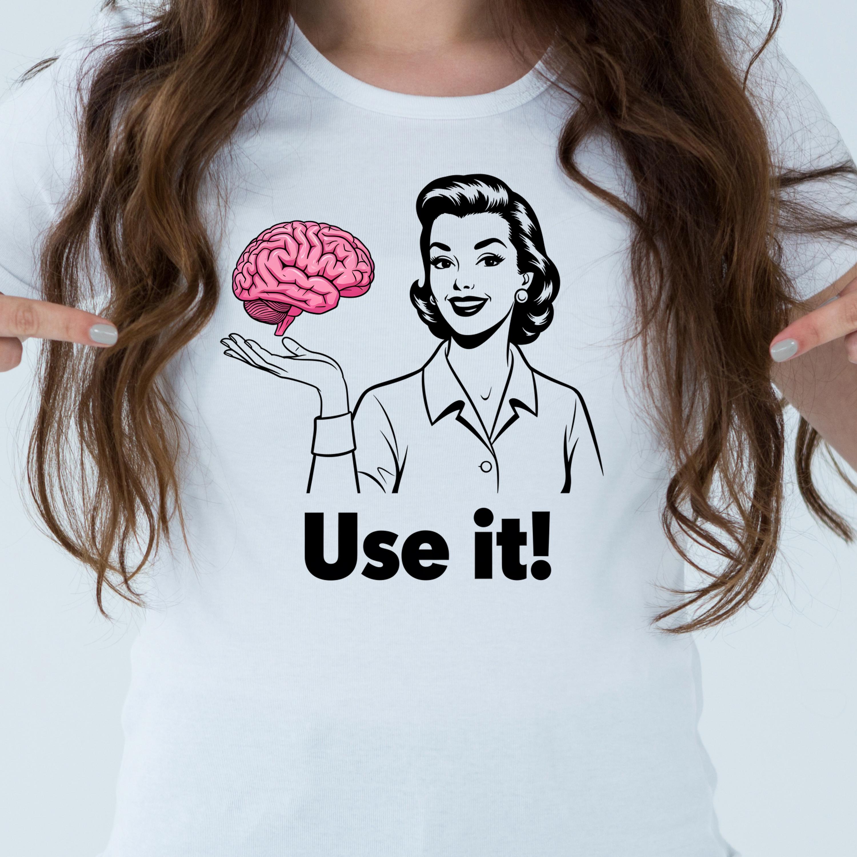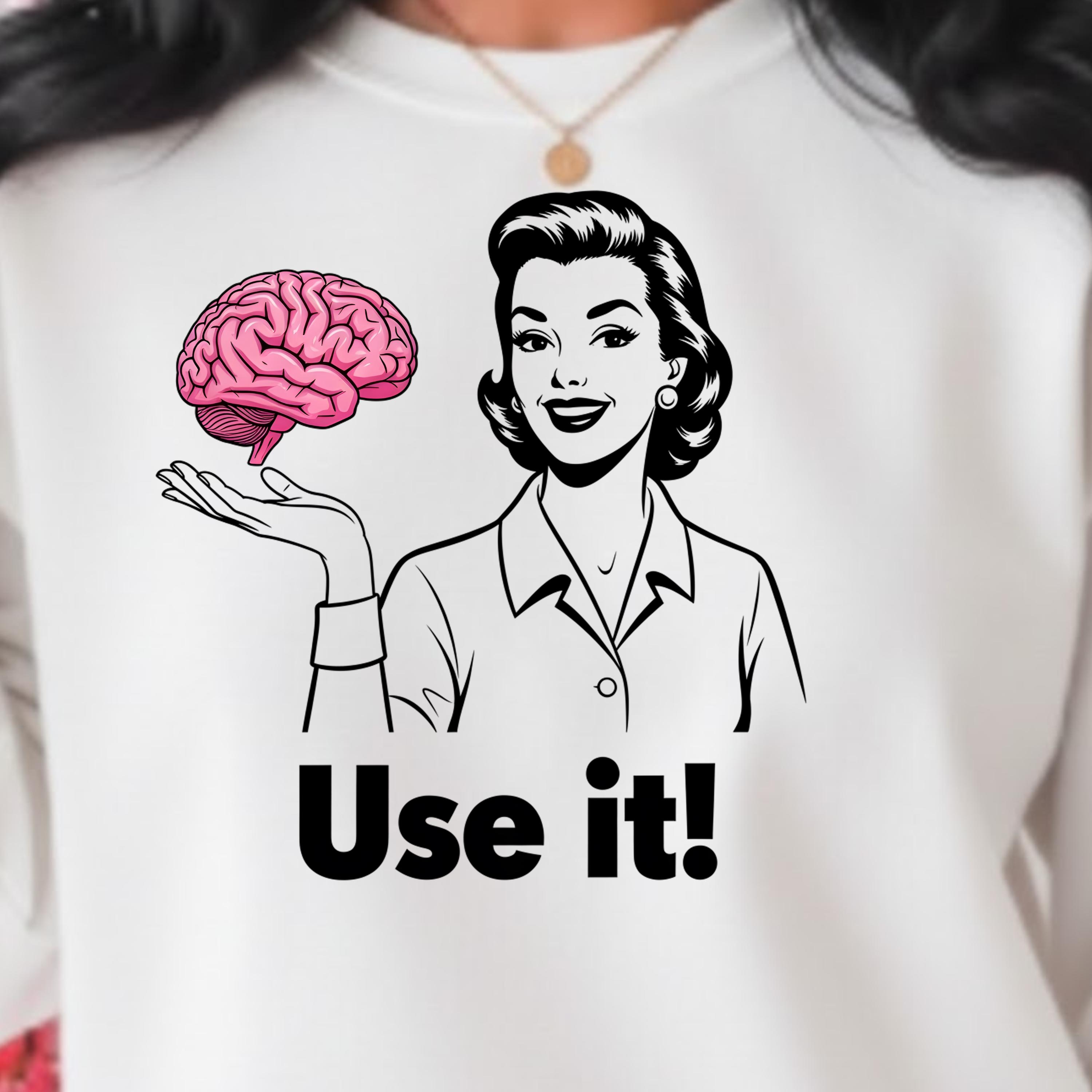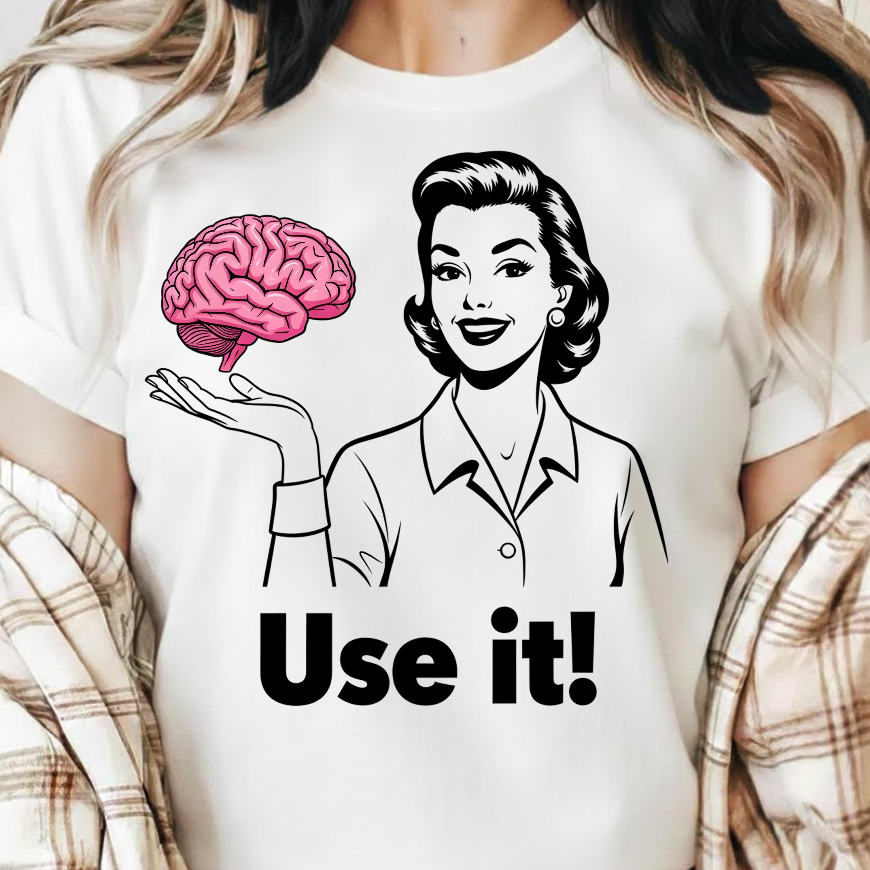 Use It PNG, Retro Woman Holding Brain Graphic, Funny Motivational Quote Design, Vintage Style Shirt Art, Sarcastic Humor Sublimation