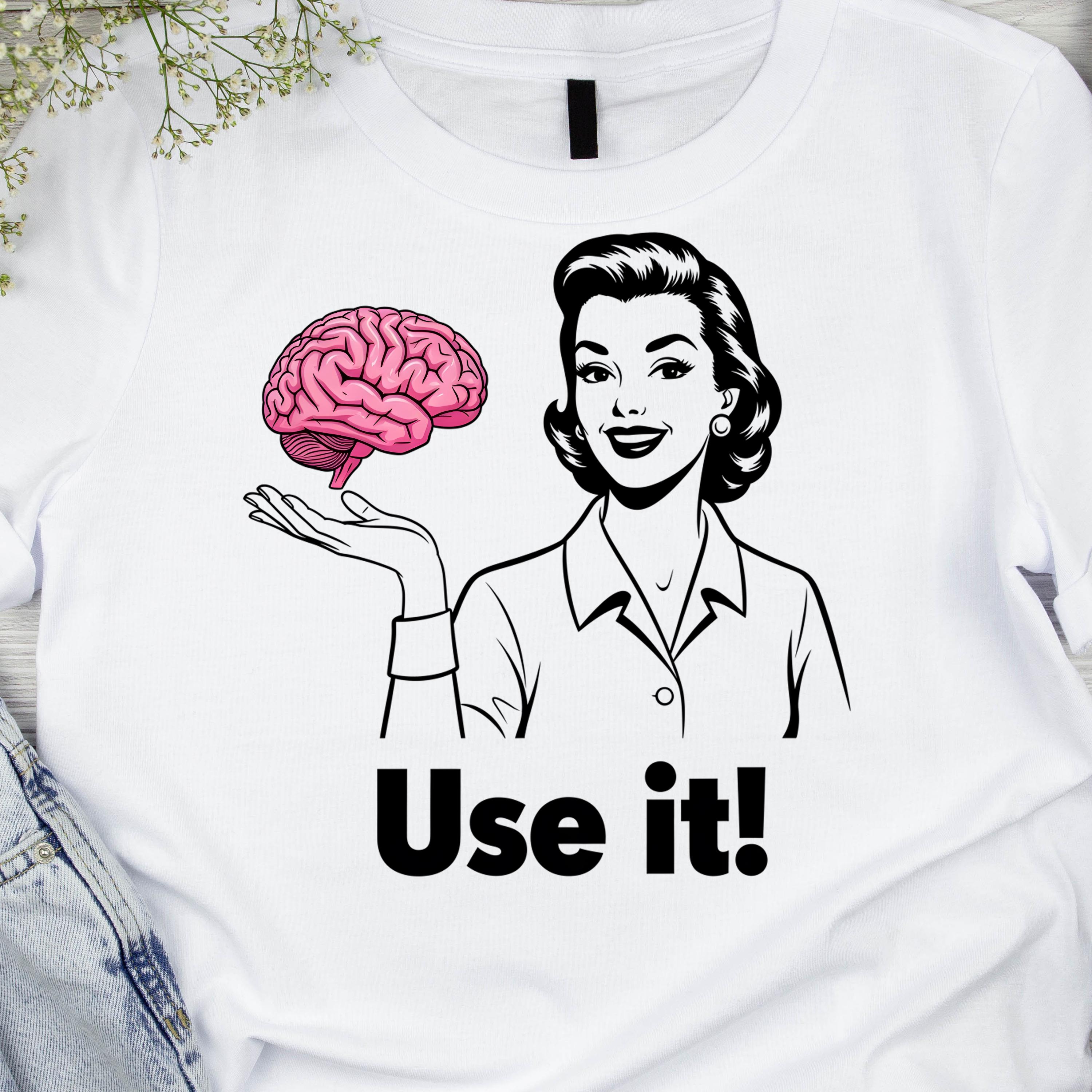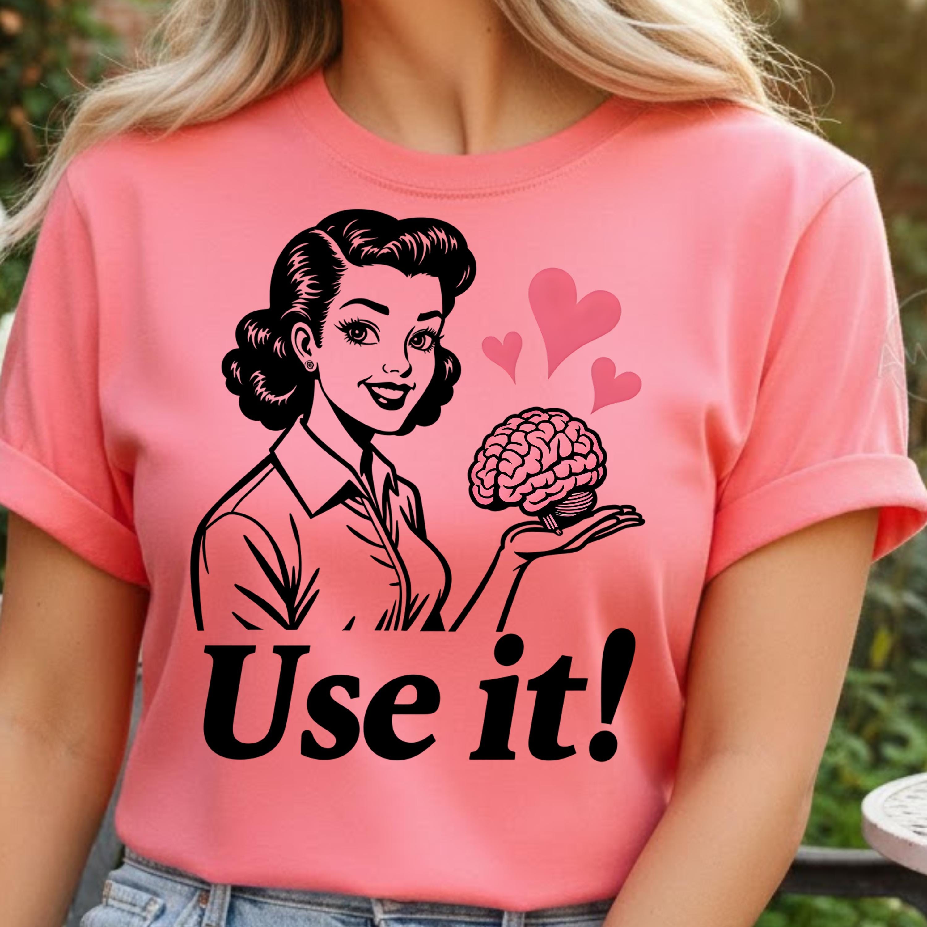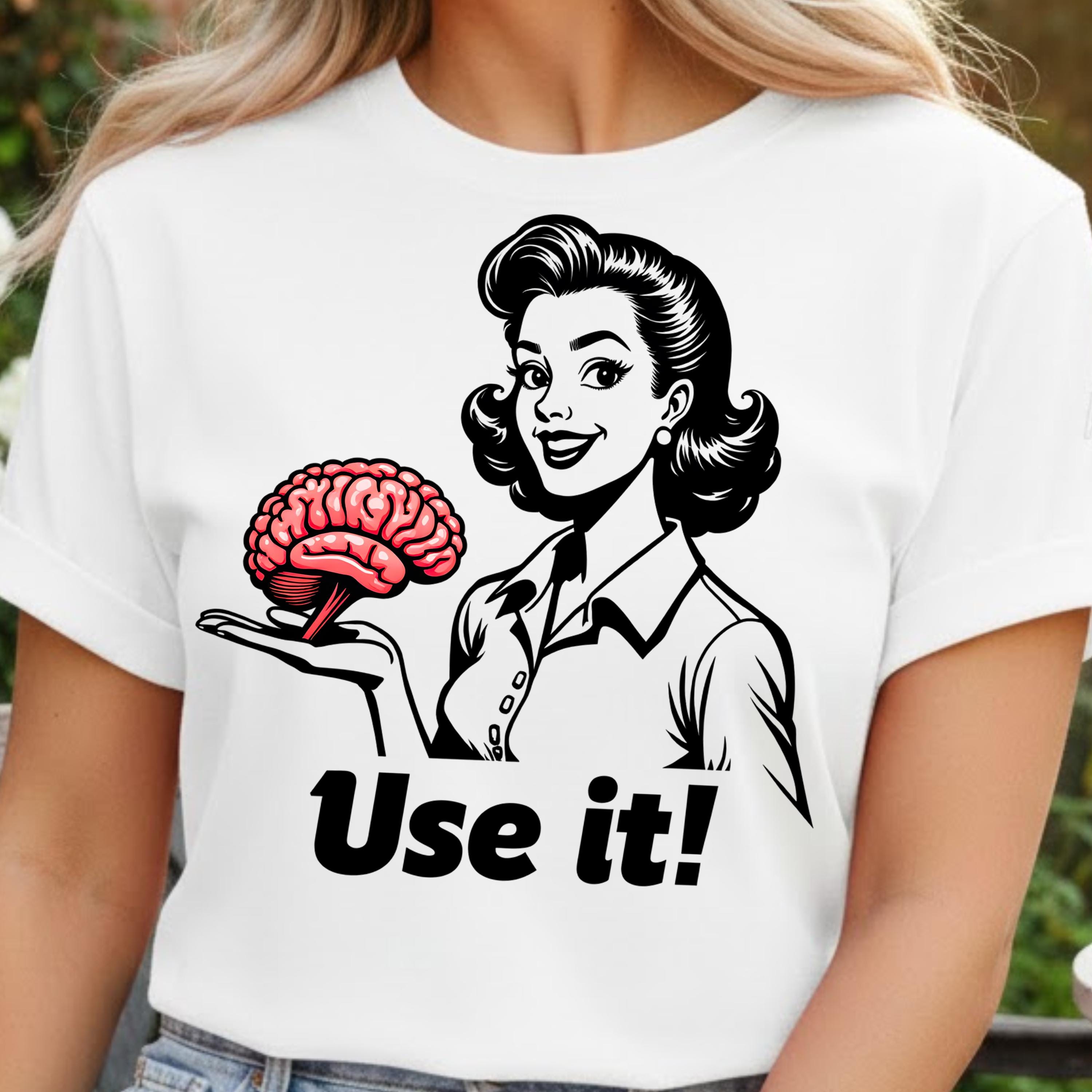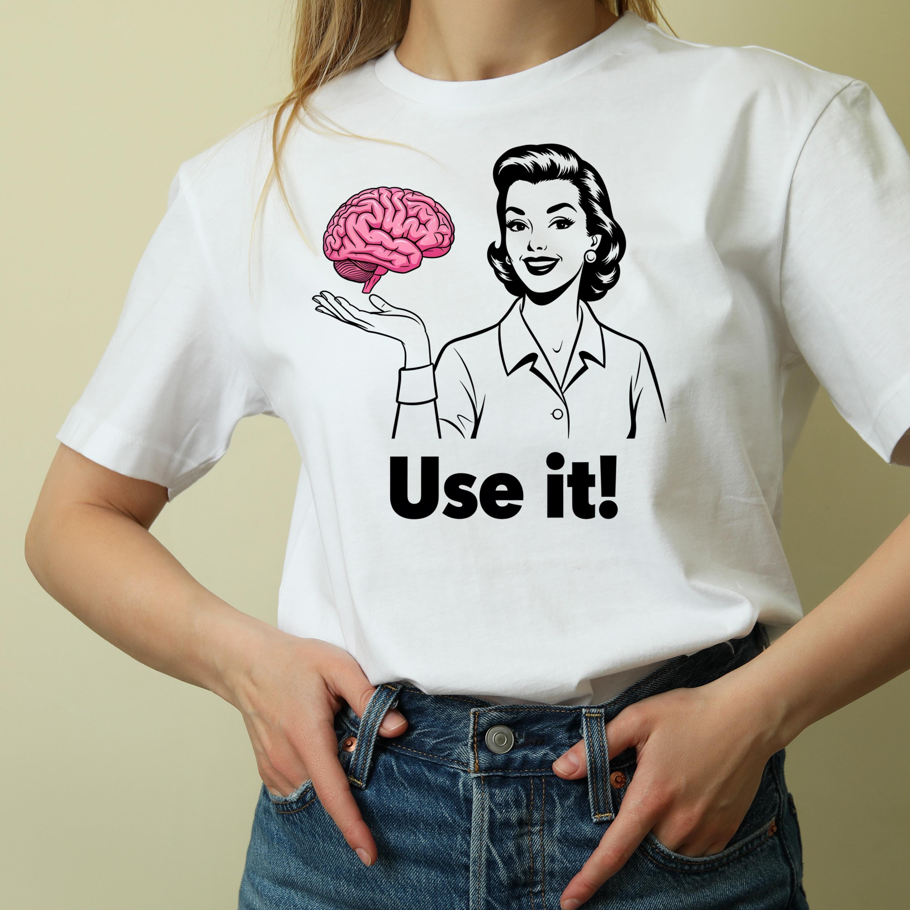 Use It PNG, Retro Woman Holding Brain Graphic, Funny Motivational Quote Design, Vintage Style Shirt Art, Sarcastic Humor Sublimation