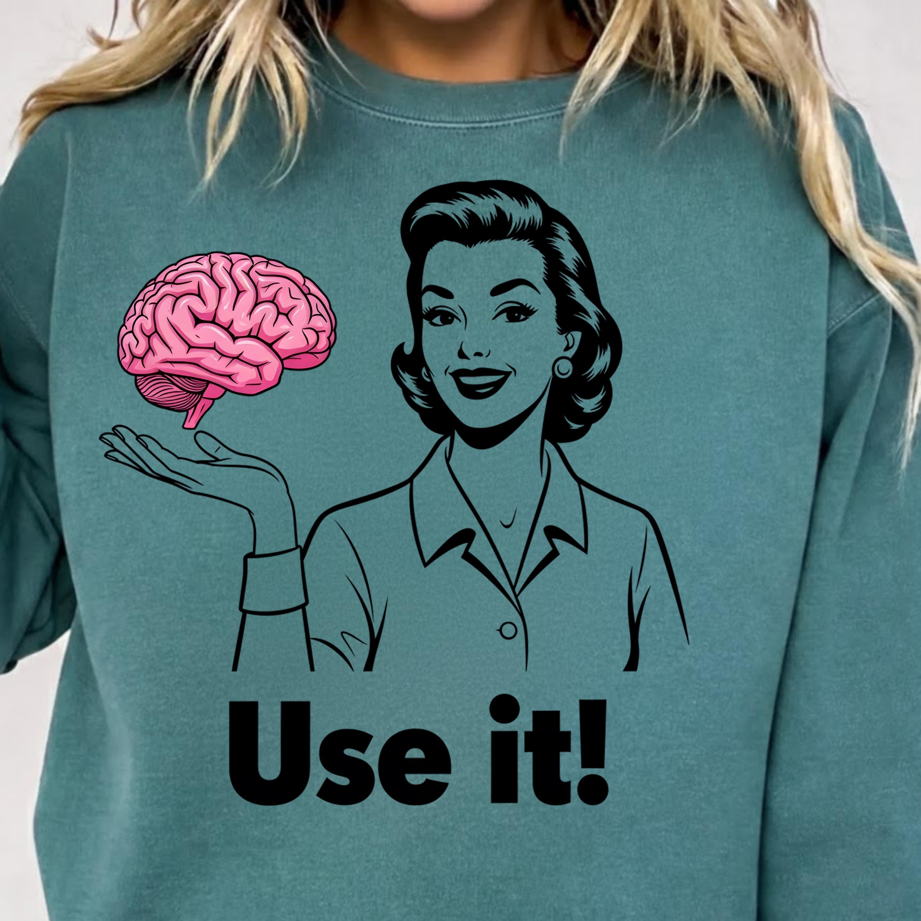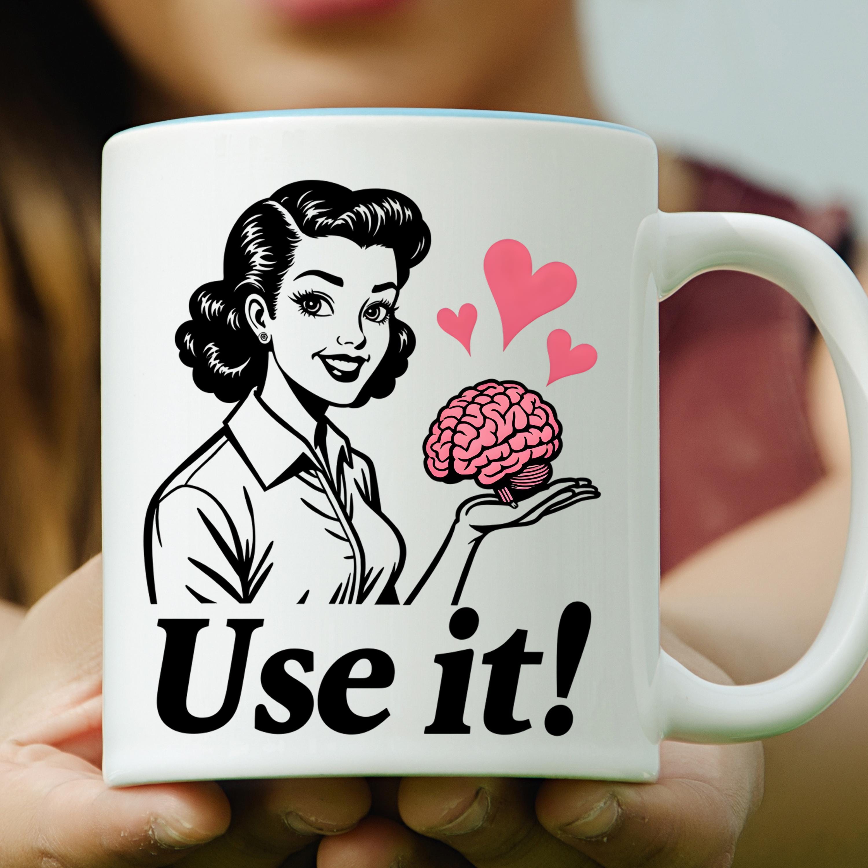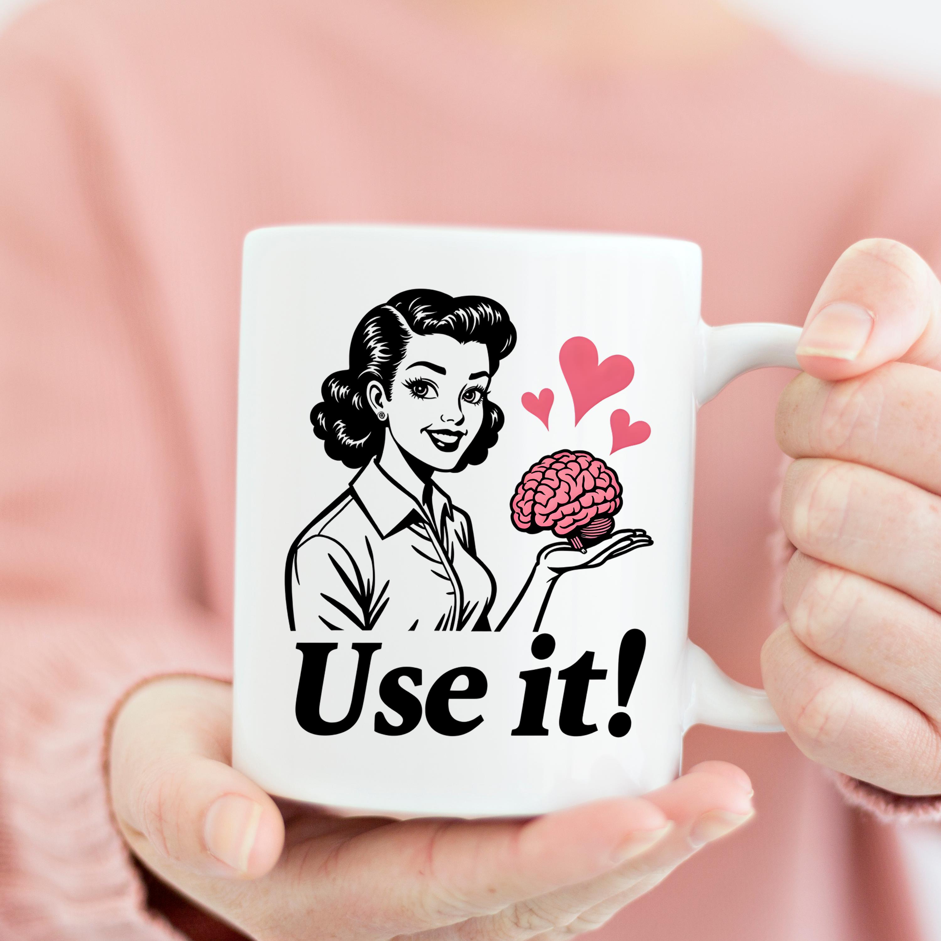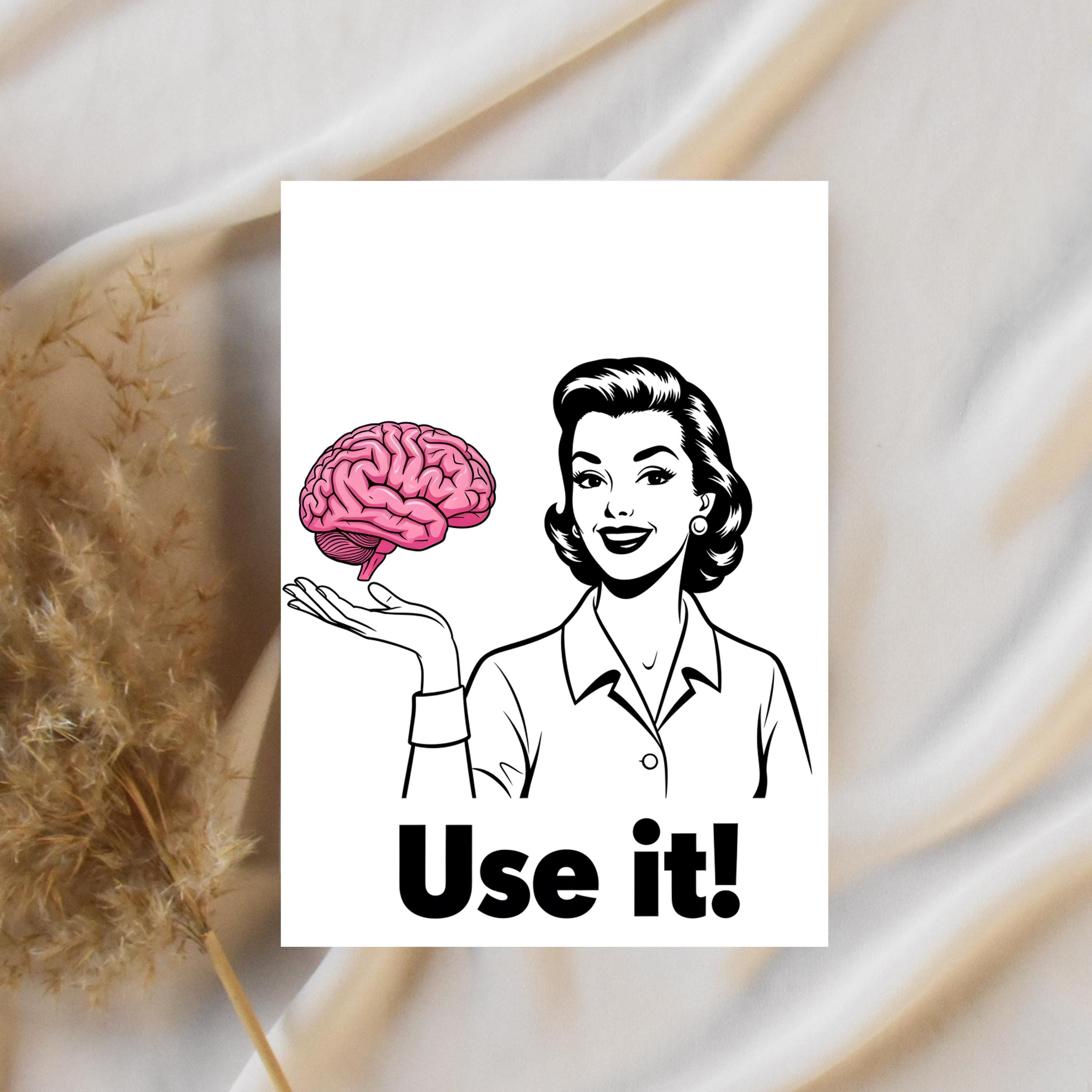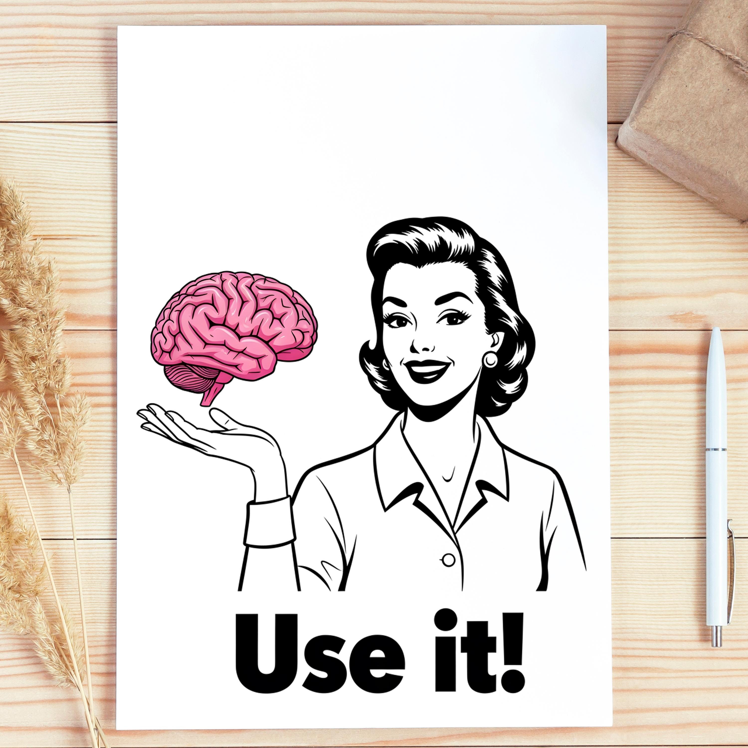 Use It PNG, Retro Woman Holding Brain Graphic, Funny Motivational Quote Design, Vintage Style Shirt Art, Sarcastic Humor Sublimation, Digital Download