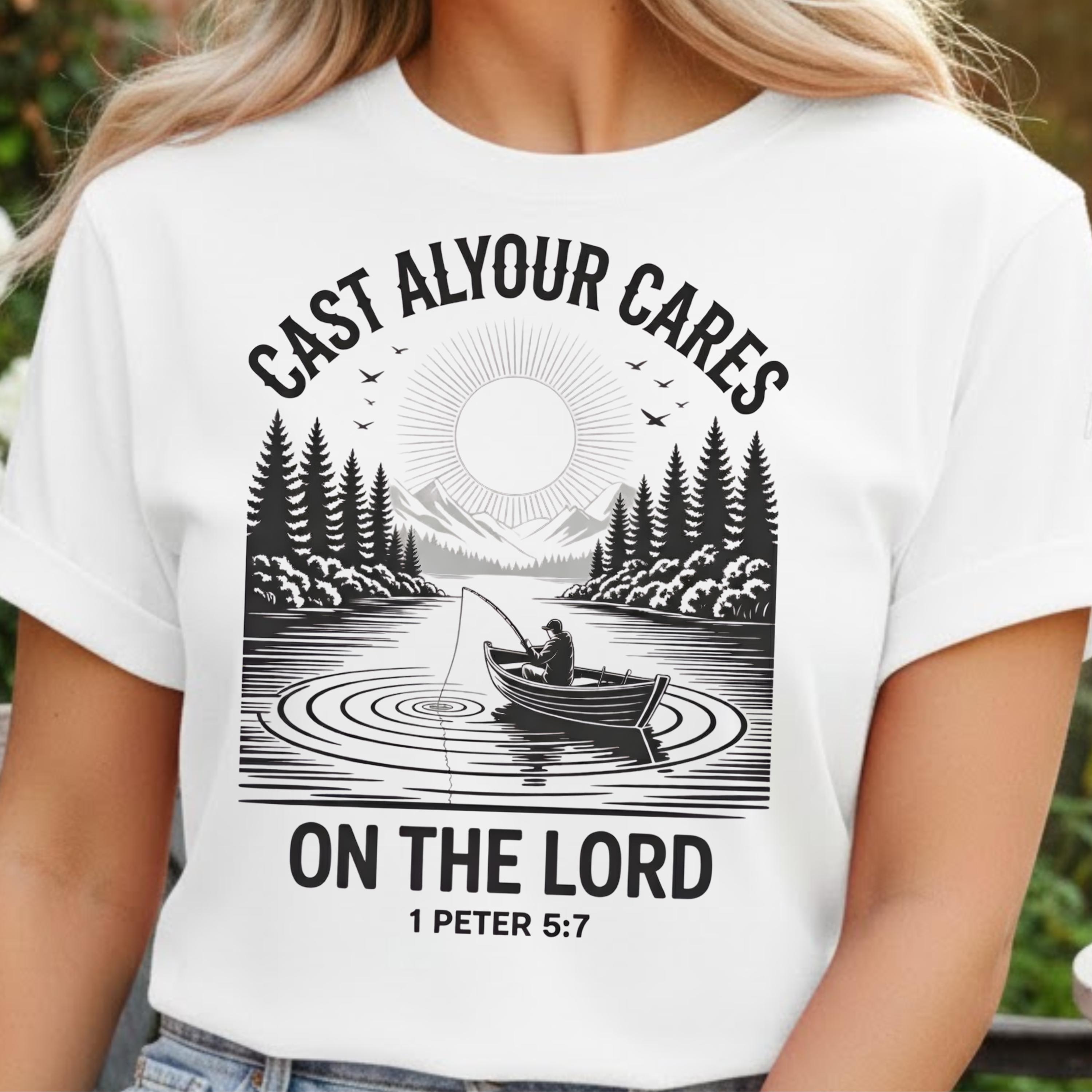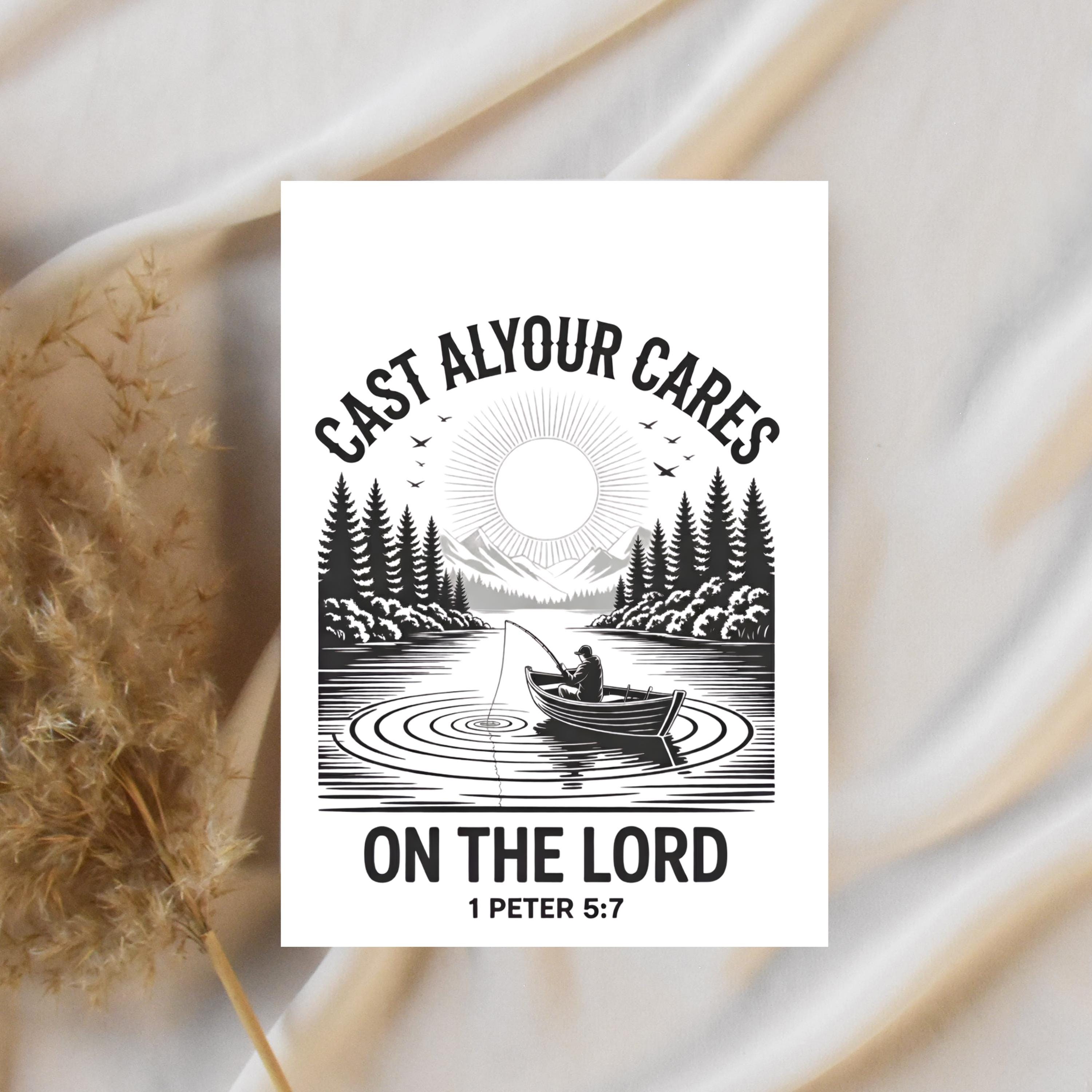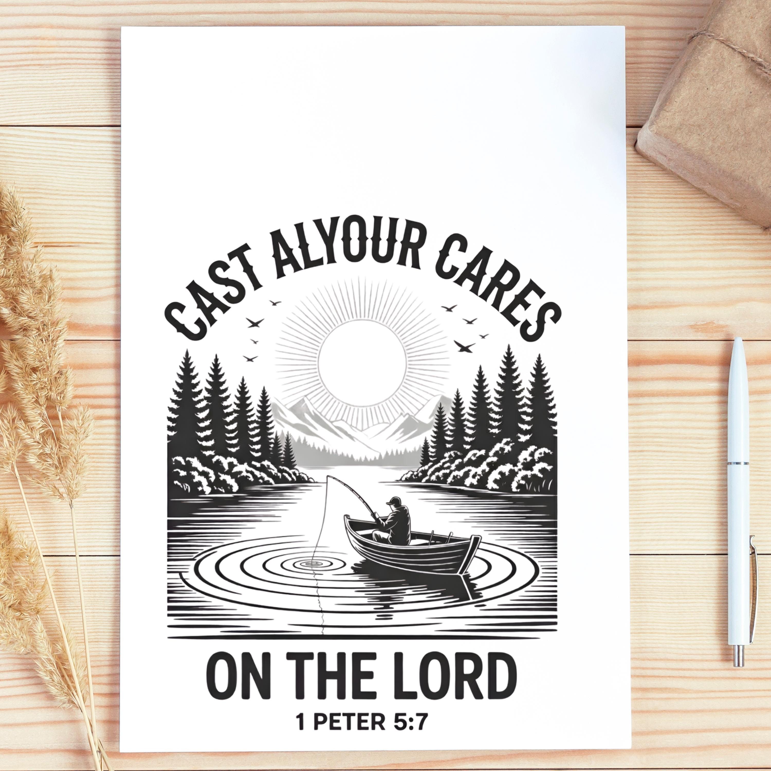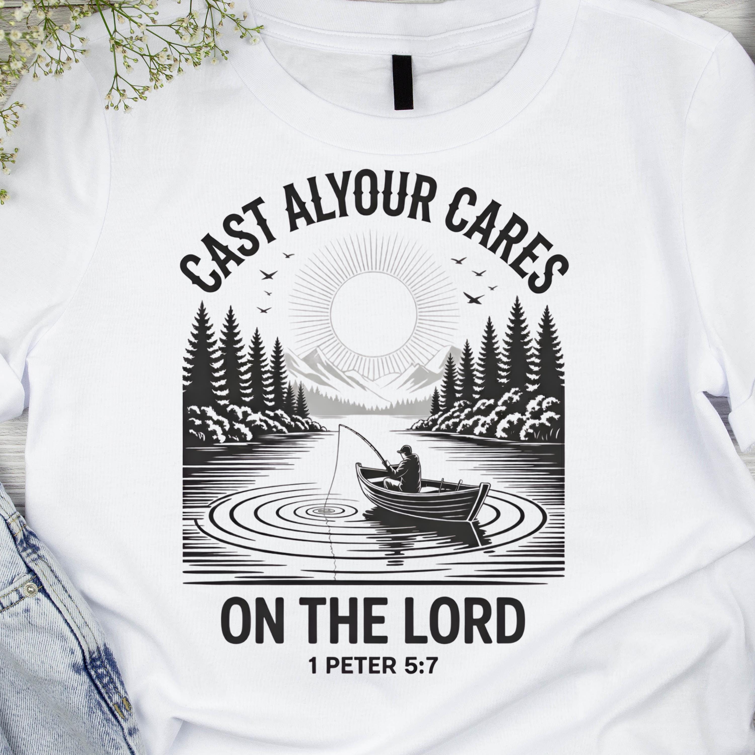Cast All Your Cares PNG, Christian Fishing Shirt Design, 1 Peter 5 7 Bible Verse, Faith Outdoors Sublimation, Retro Vintage Style