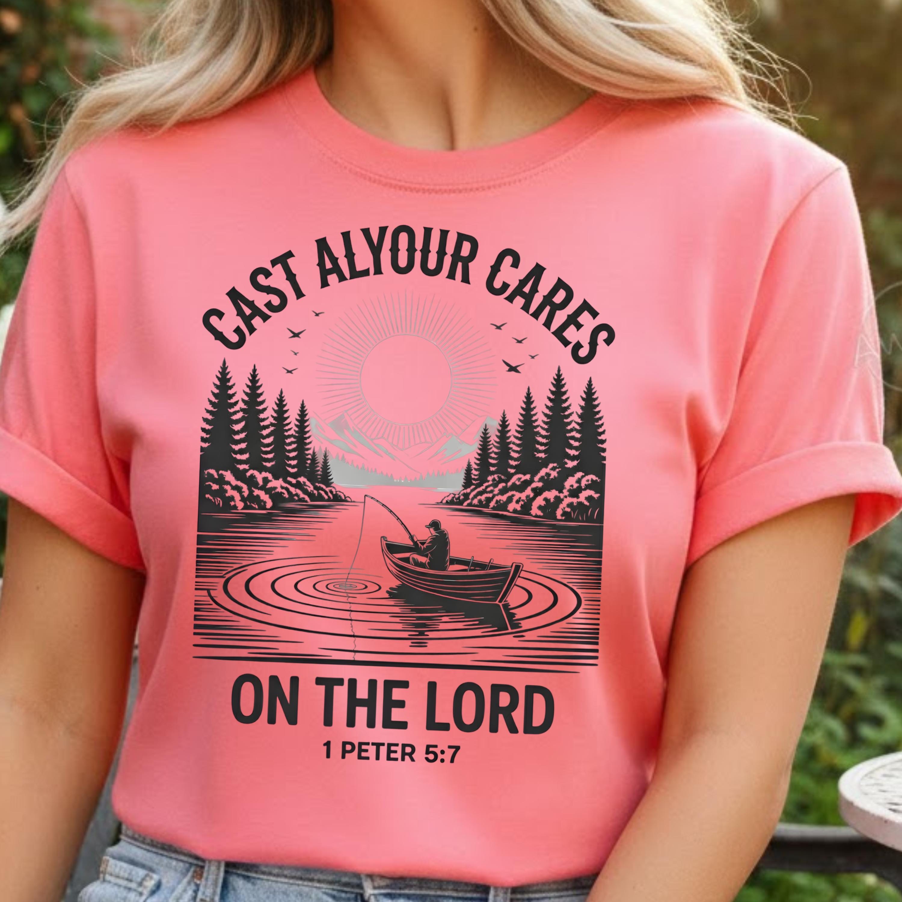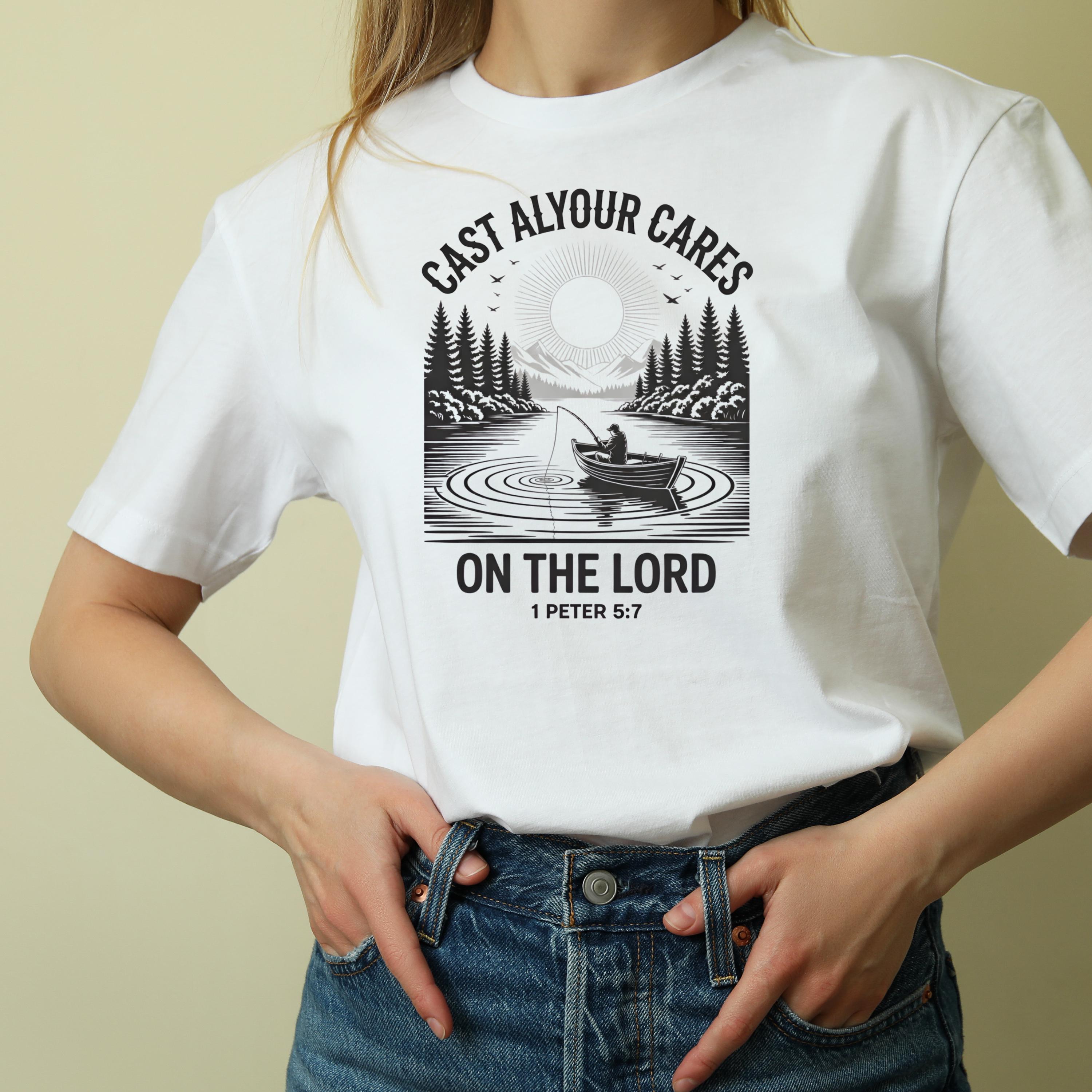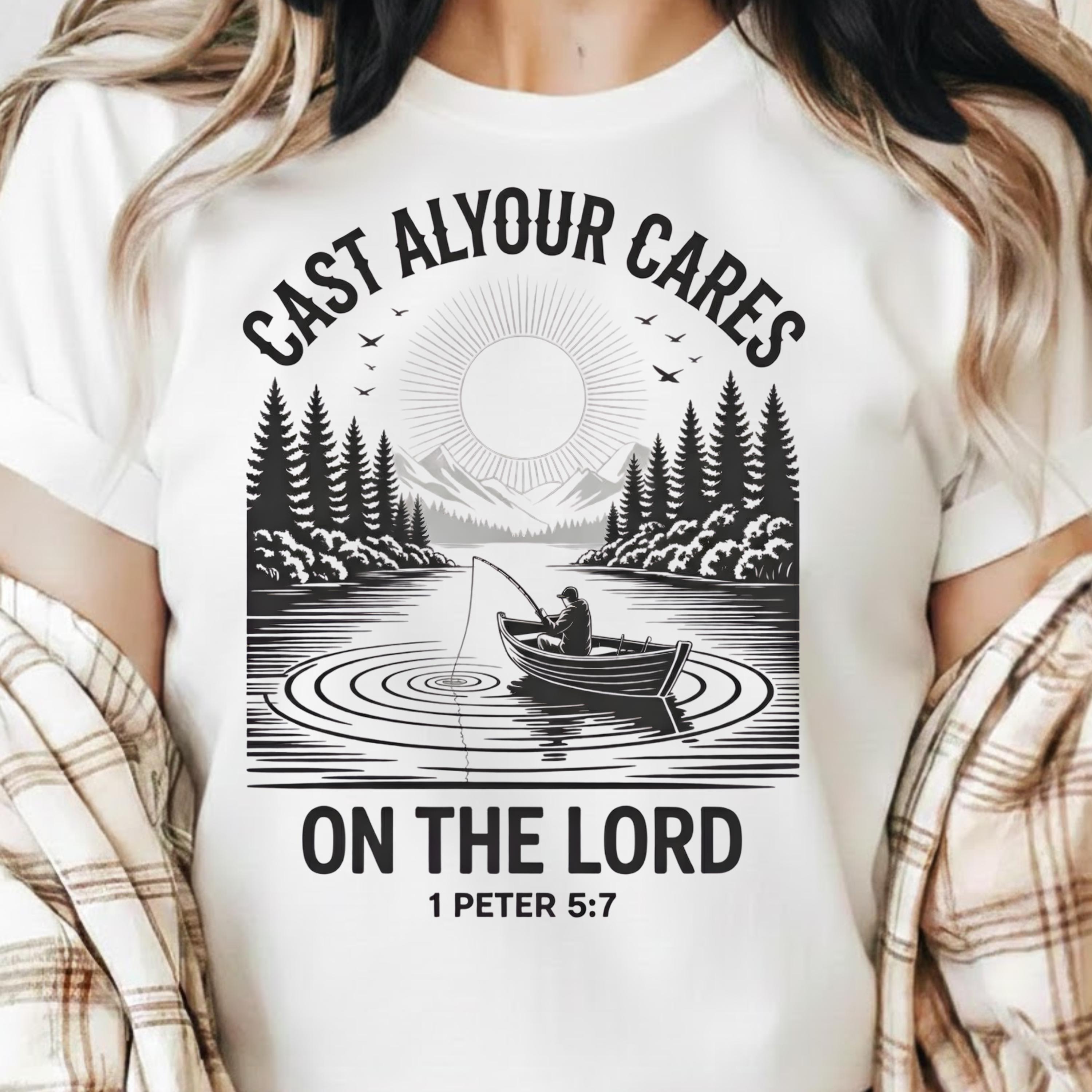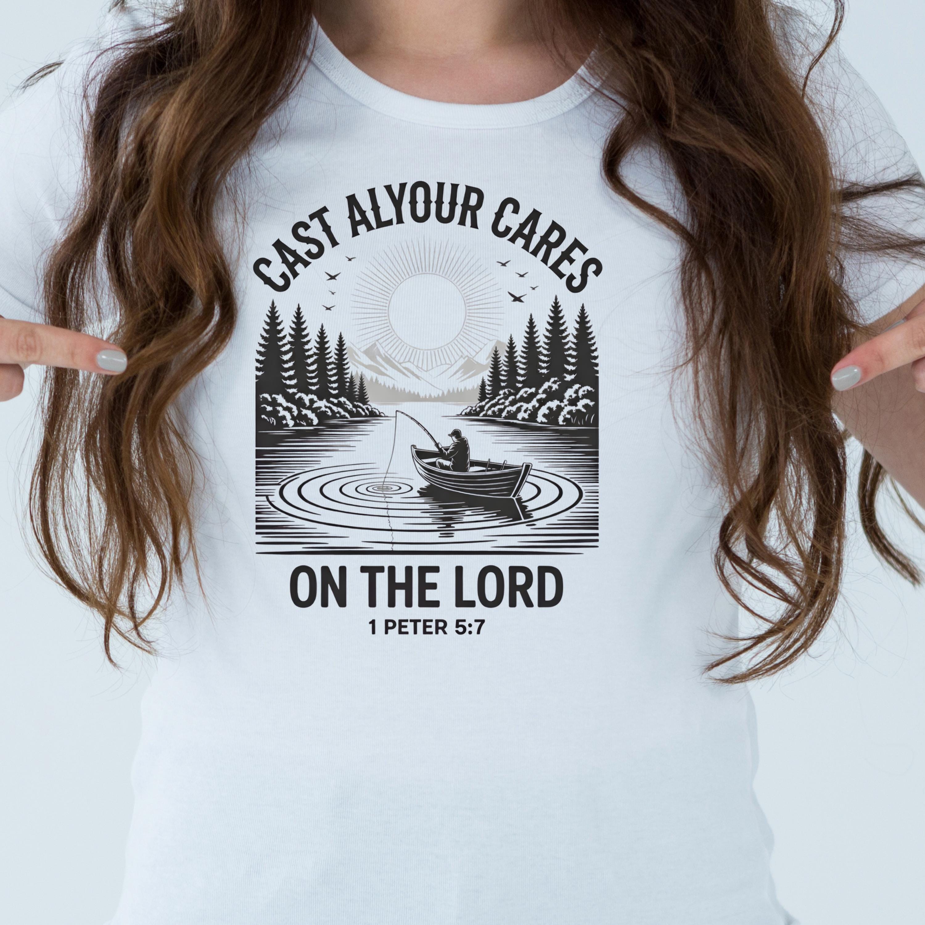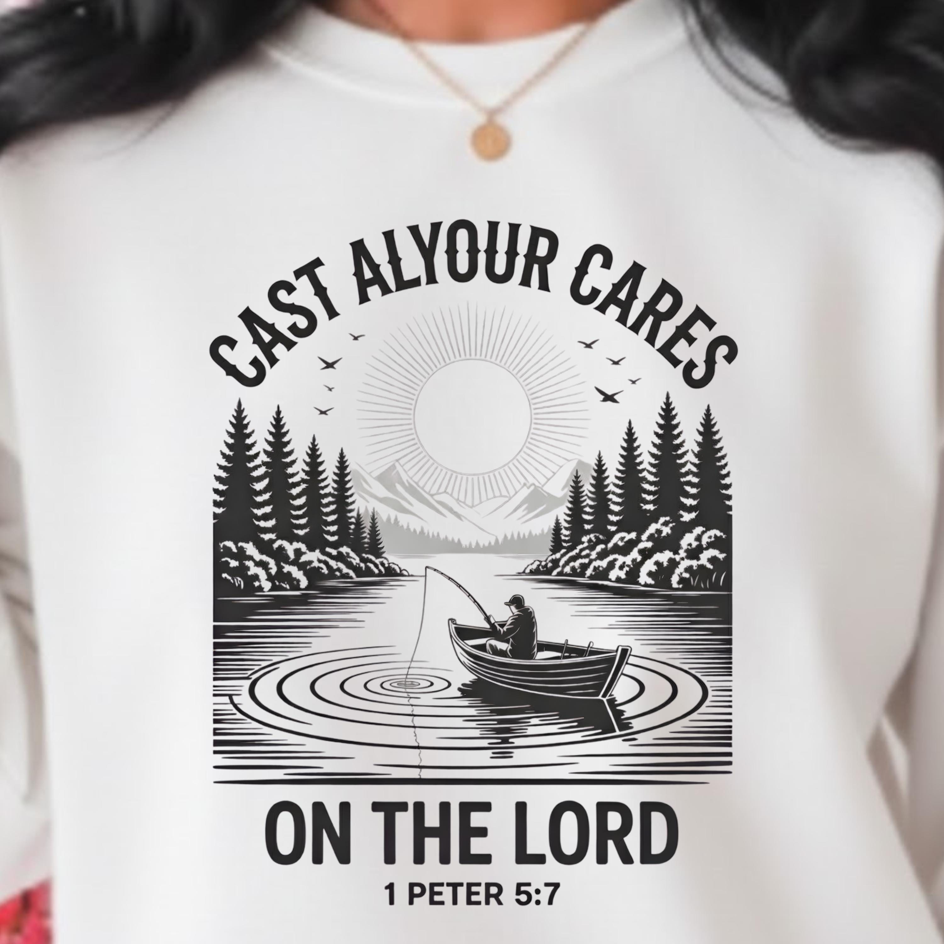 Cast All Your Cares PNG, Christian Fishing Shirt Design, 1 Peter 5 7 Bible Verse, Faith Outdoors Sublimation, Retro Vintage Style