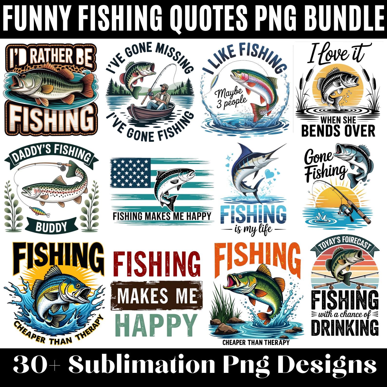 Funny Fishing Quotes PNG Bundle, Fishing Humor Sayings, Fisherman Quote Designs, Bass Trout Art, T-Shirt & Sticker Graphics,Digital Download