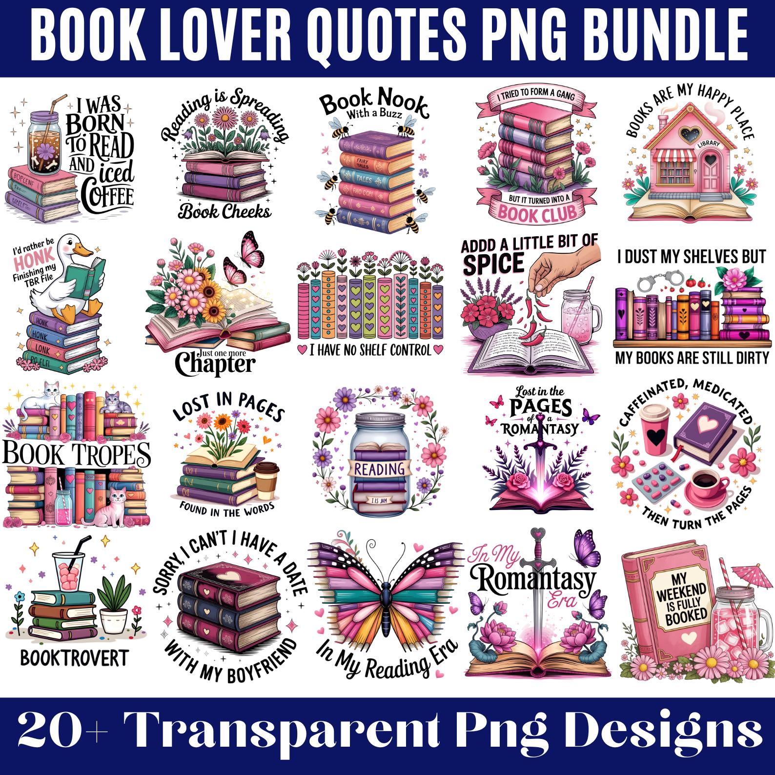20+ Books Quotes PNG Bundle, Book Reading Clipart, Floral Book Png, Colorful design Bookish Sublimation, Book lover Png, Book Lover Sticker