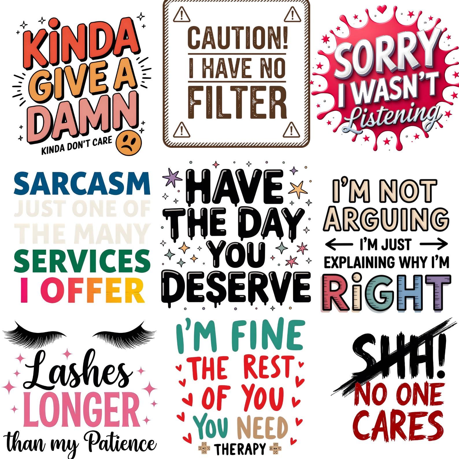 Add humor and personality to your designs with this Funny Sarcastic Quotes PNG Bundle. This collection features colorful and trendy quote designs with sarcastic humor, funny sayings, and retro-style graphics. These designs are perfect for anyone who loves bold humor and expressive quotes.
