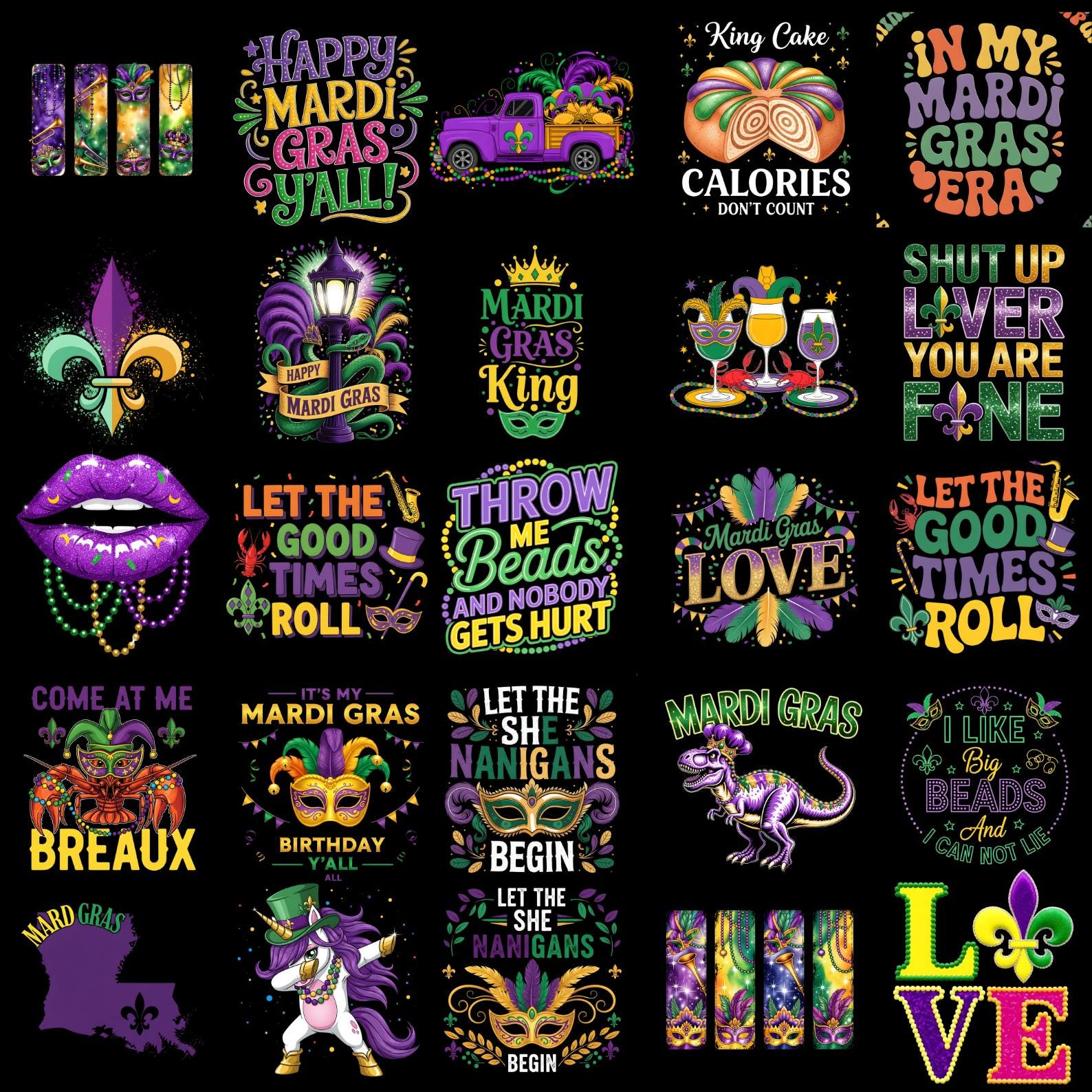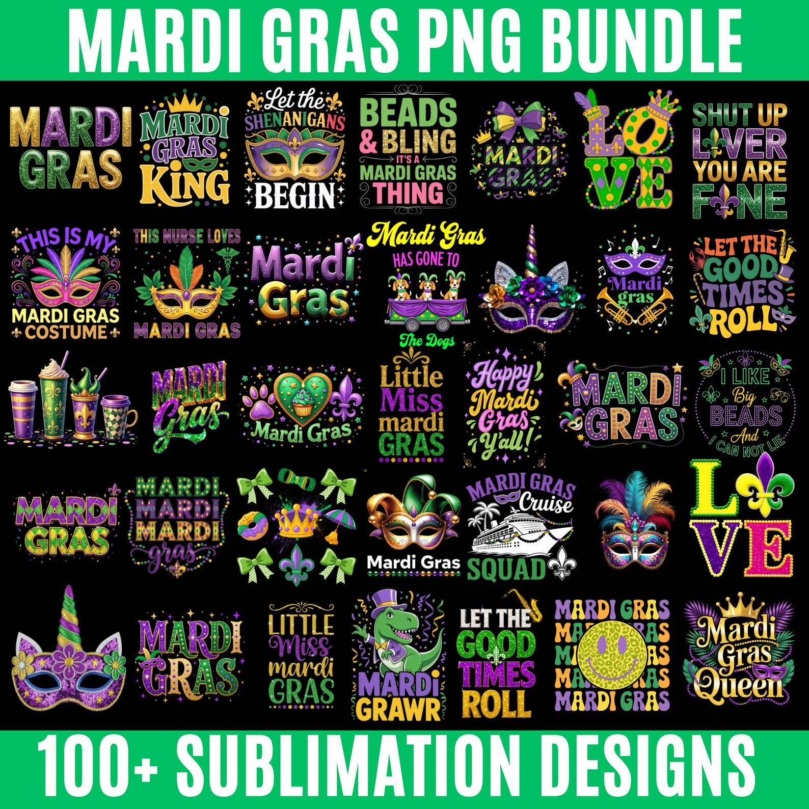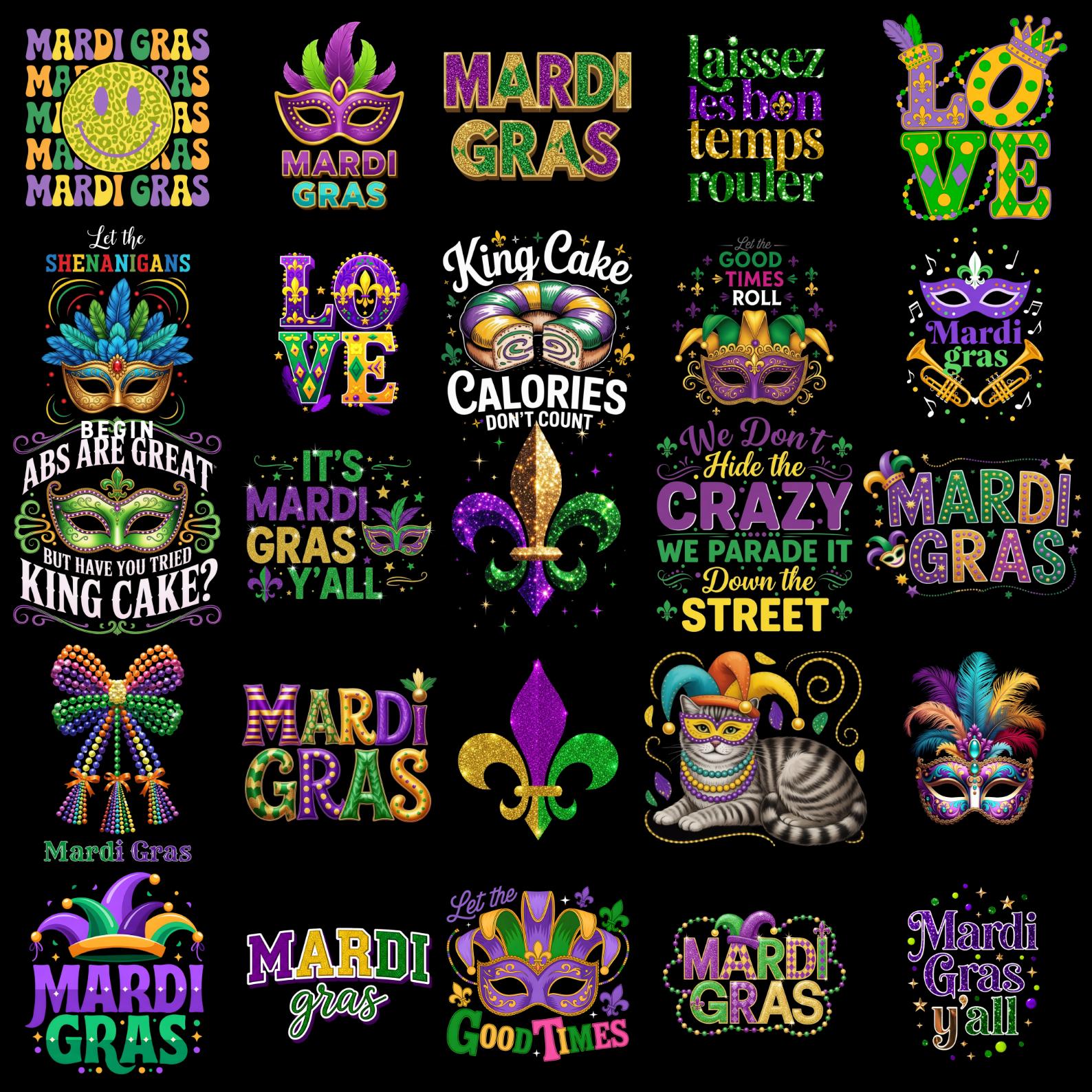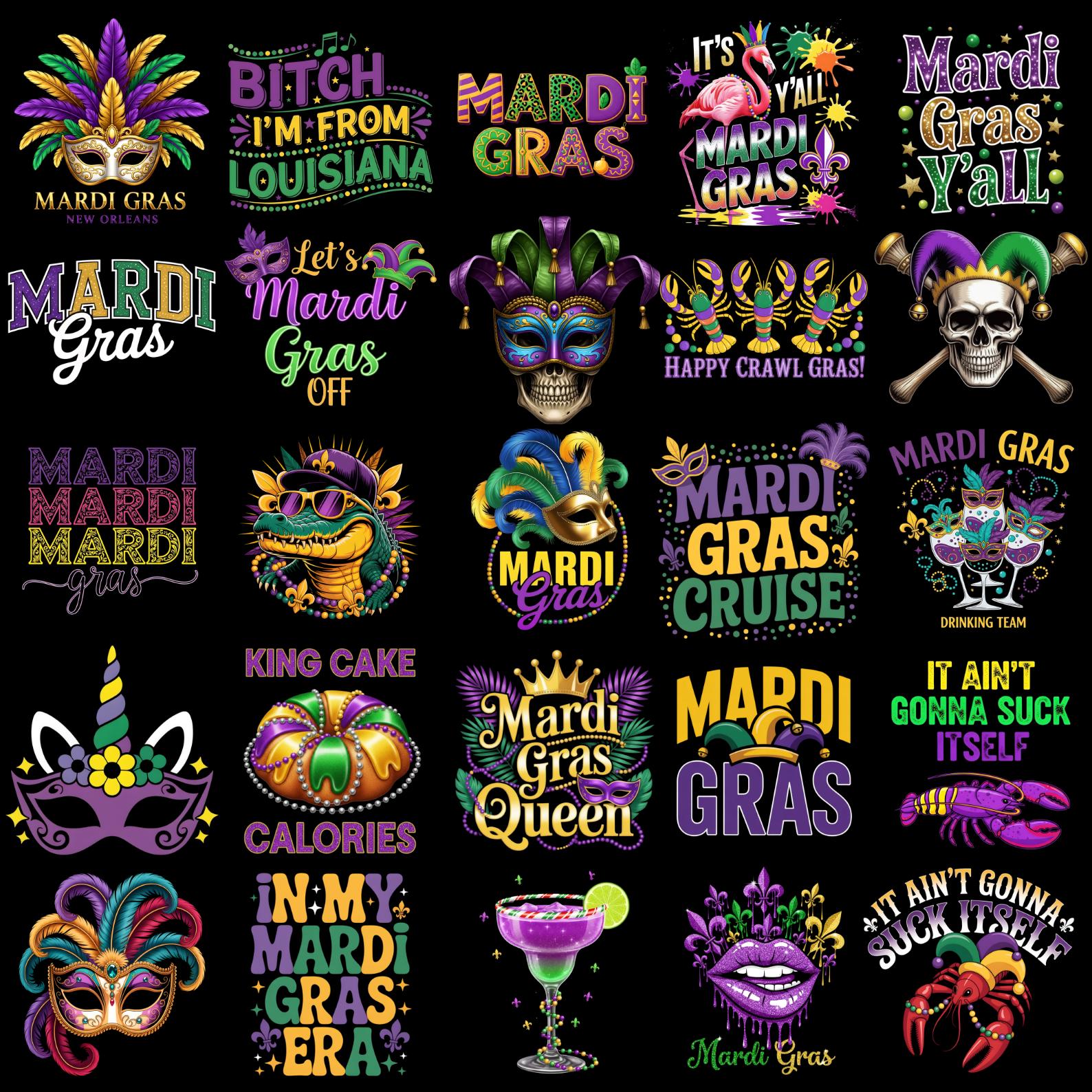 Celebrate the vibrant spirit of Mardi Gras with this Mardi Gras PNG Bundle. This collection includes 100+ colorful sublimation designs featuring masks, beads, crowns, funny quotes, and festive carnival graphics.