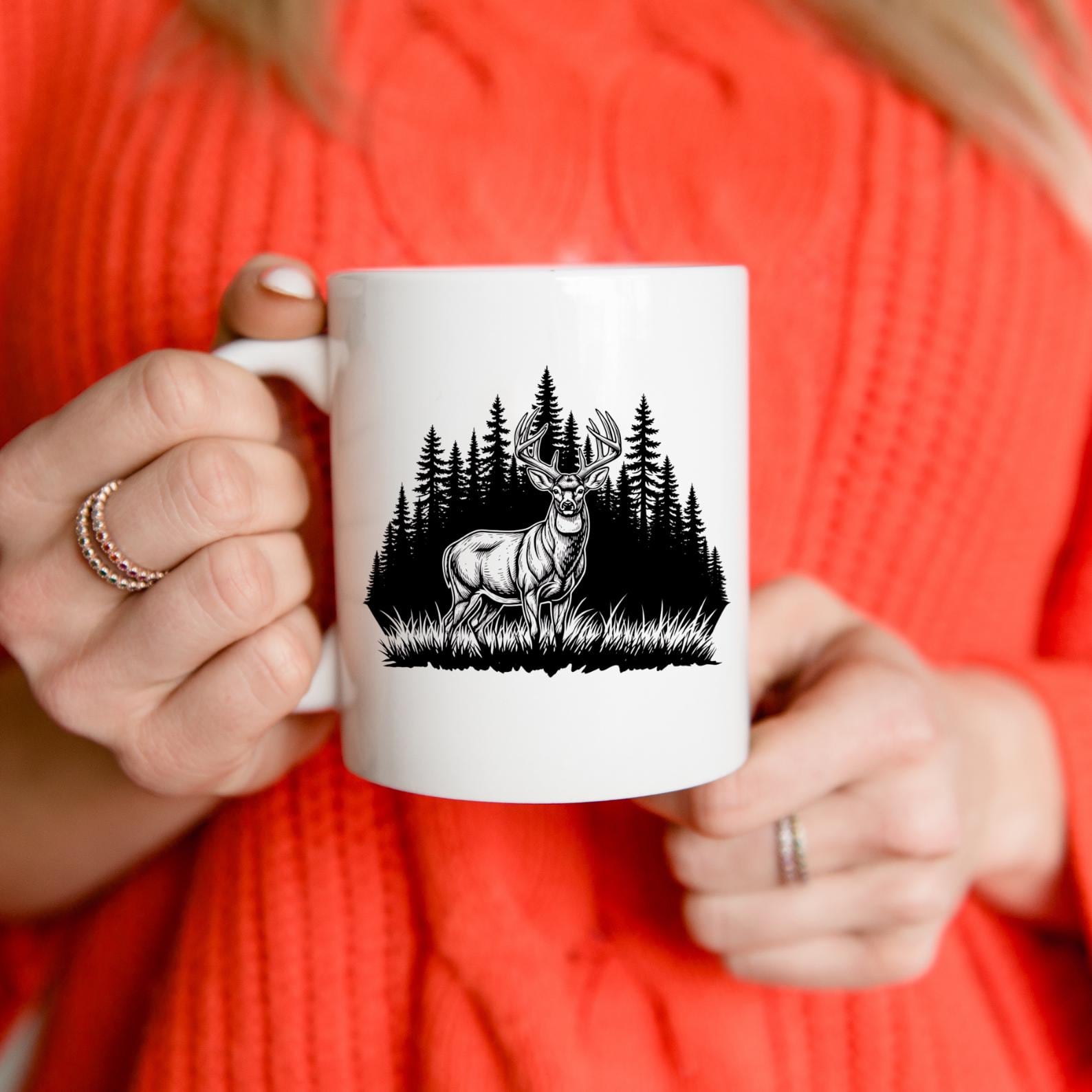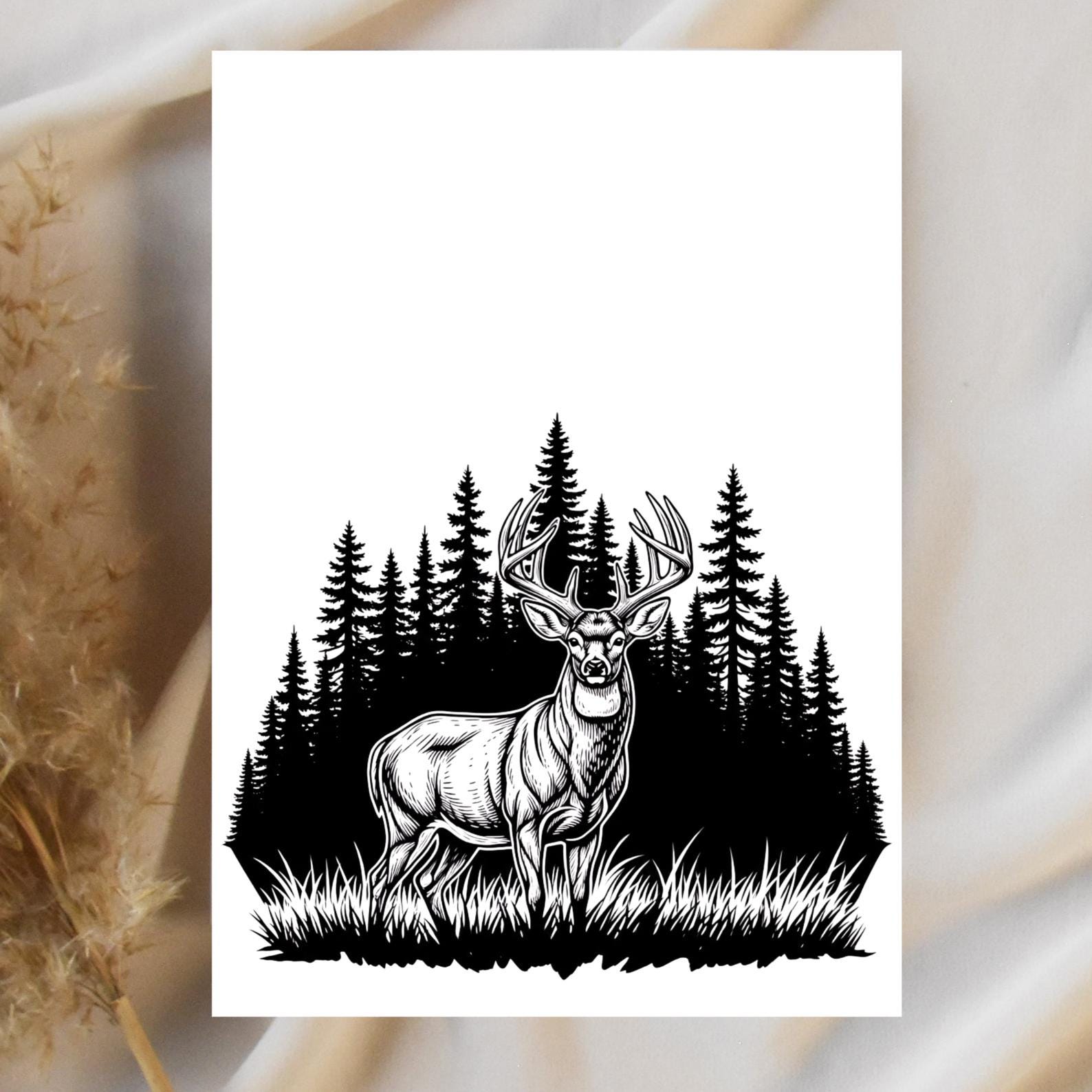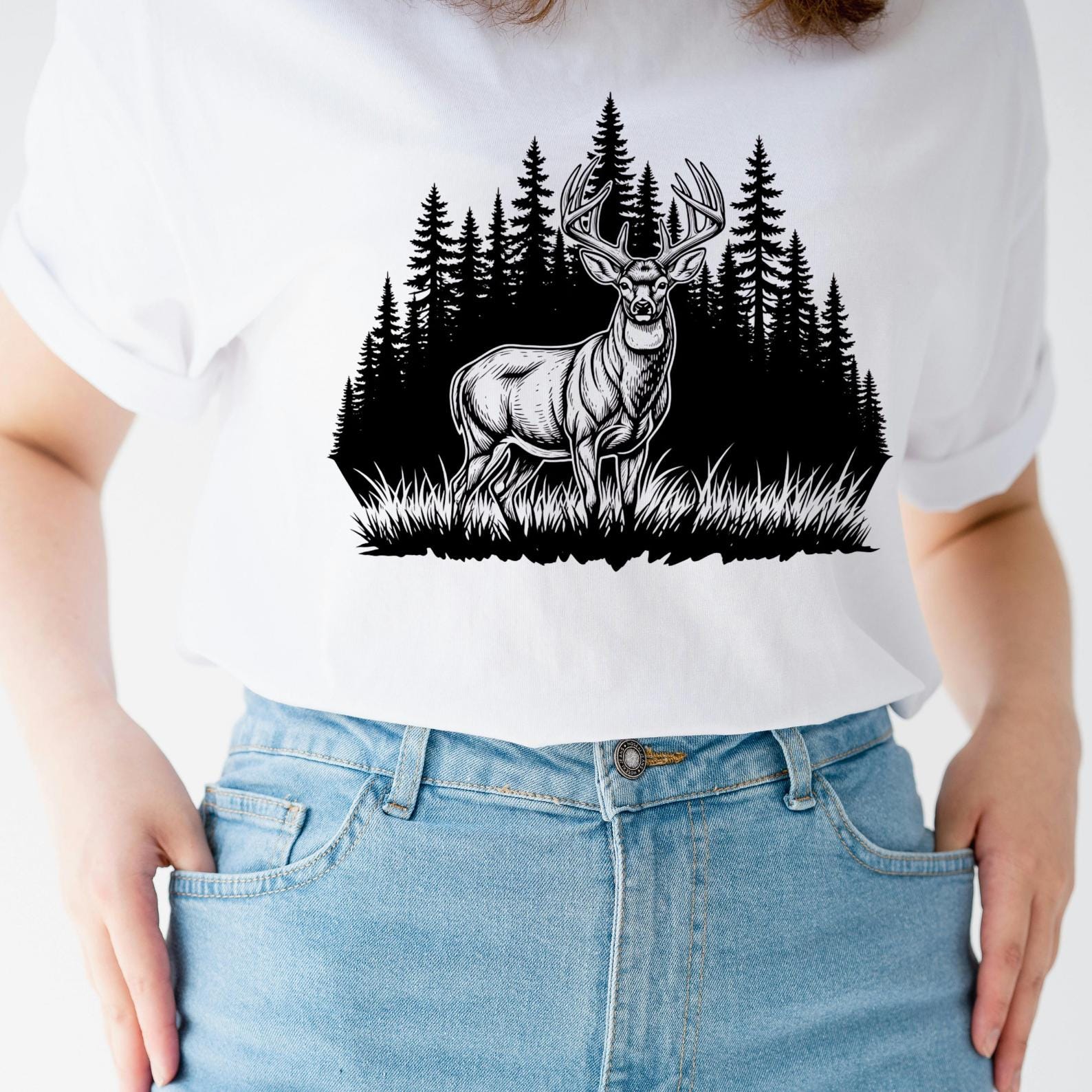 Bring the spirit of the outdoors to your designs with this Big Buck PNG. This detailed artwork features a strong whitetail buck standing in a forest, perfect for hunting and wildlife-themed projects.